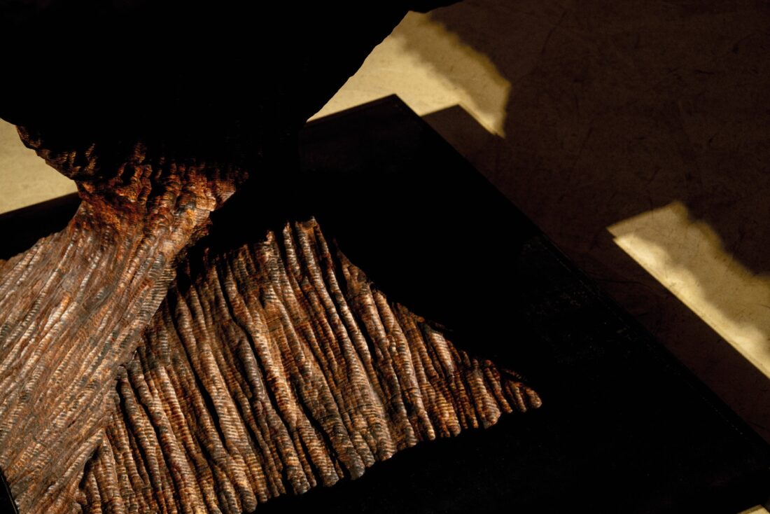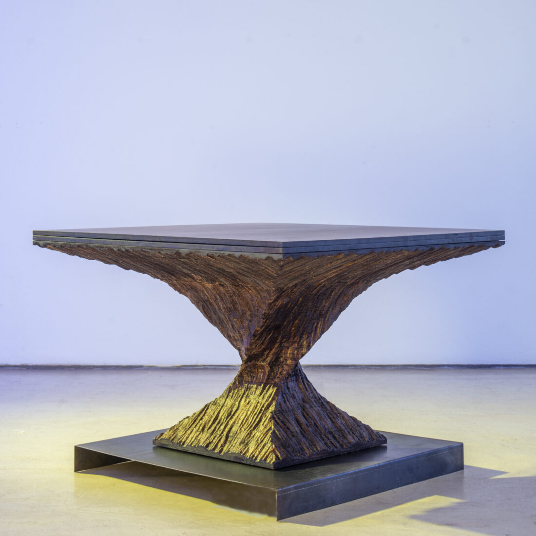 Egero, ispirato alla corteccia e alle torsioni degli alberi, è un prototipo di tavolo realizzato per la mostra SEDIMENTI di Mario Coppola a cura di Luigi Nicolais presso il museo Plart di Napoli.